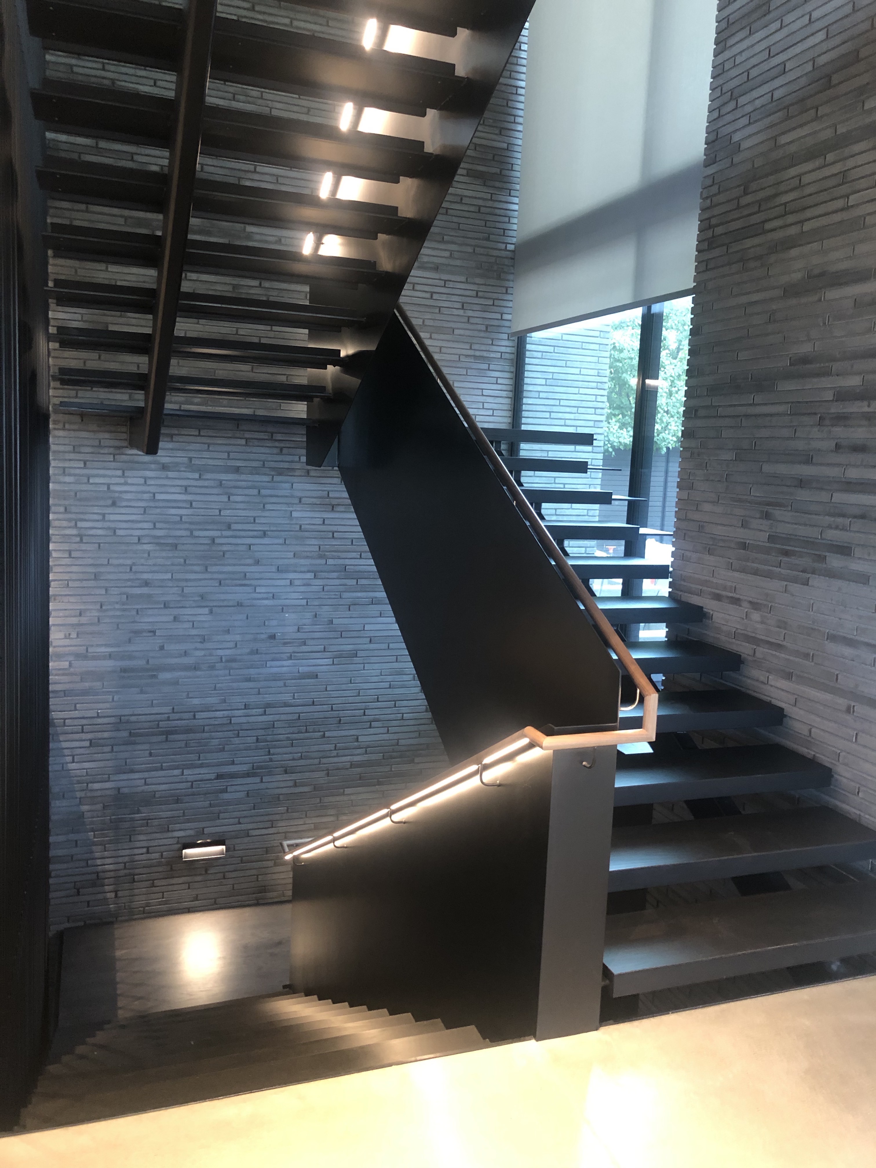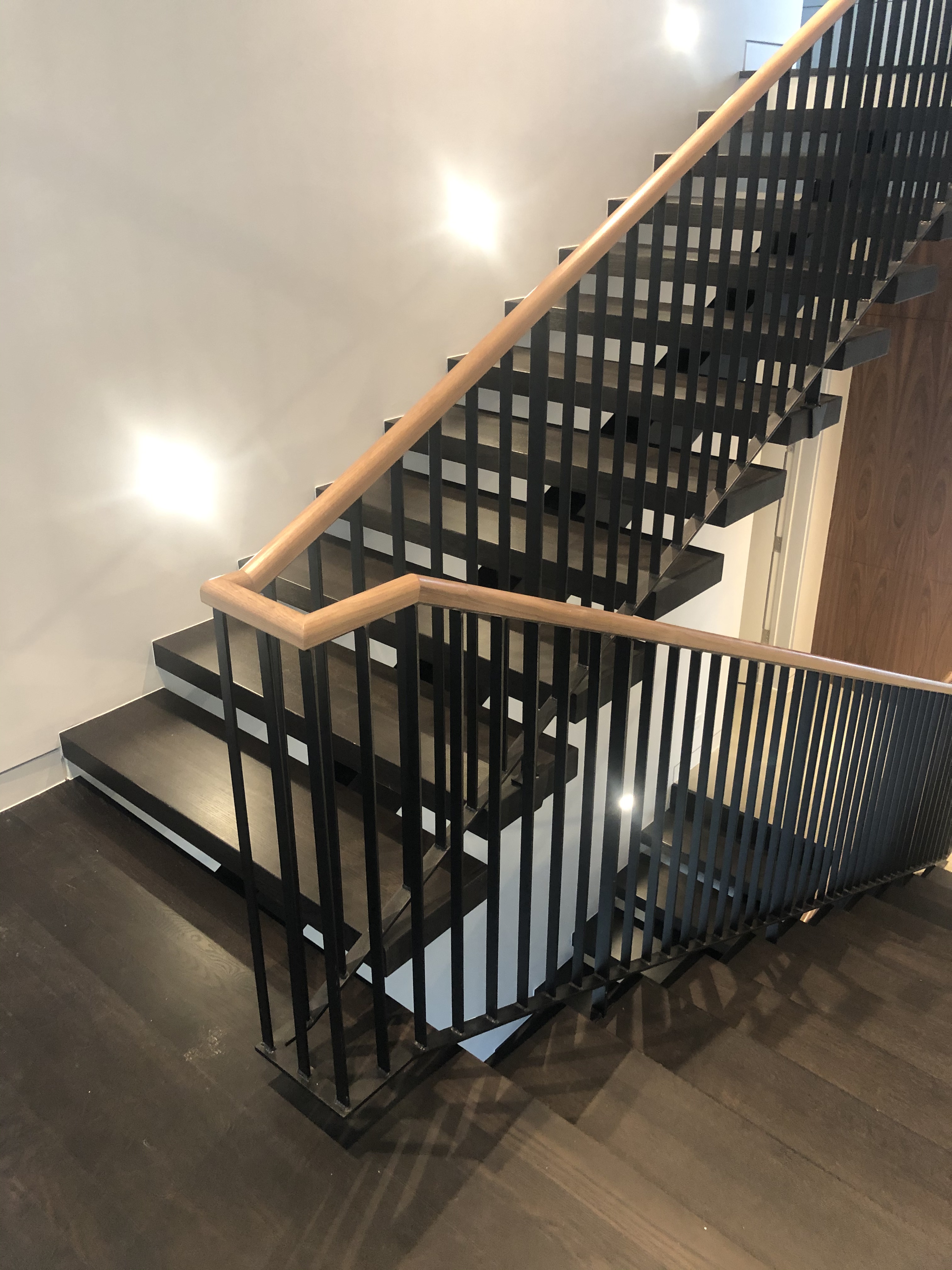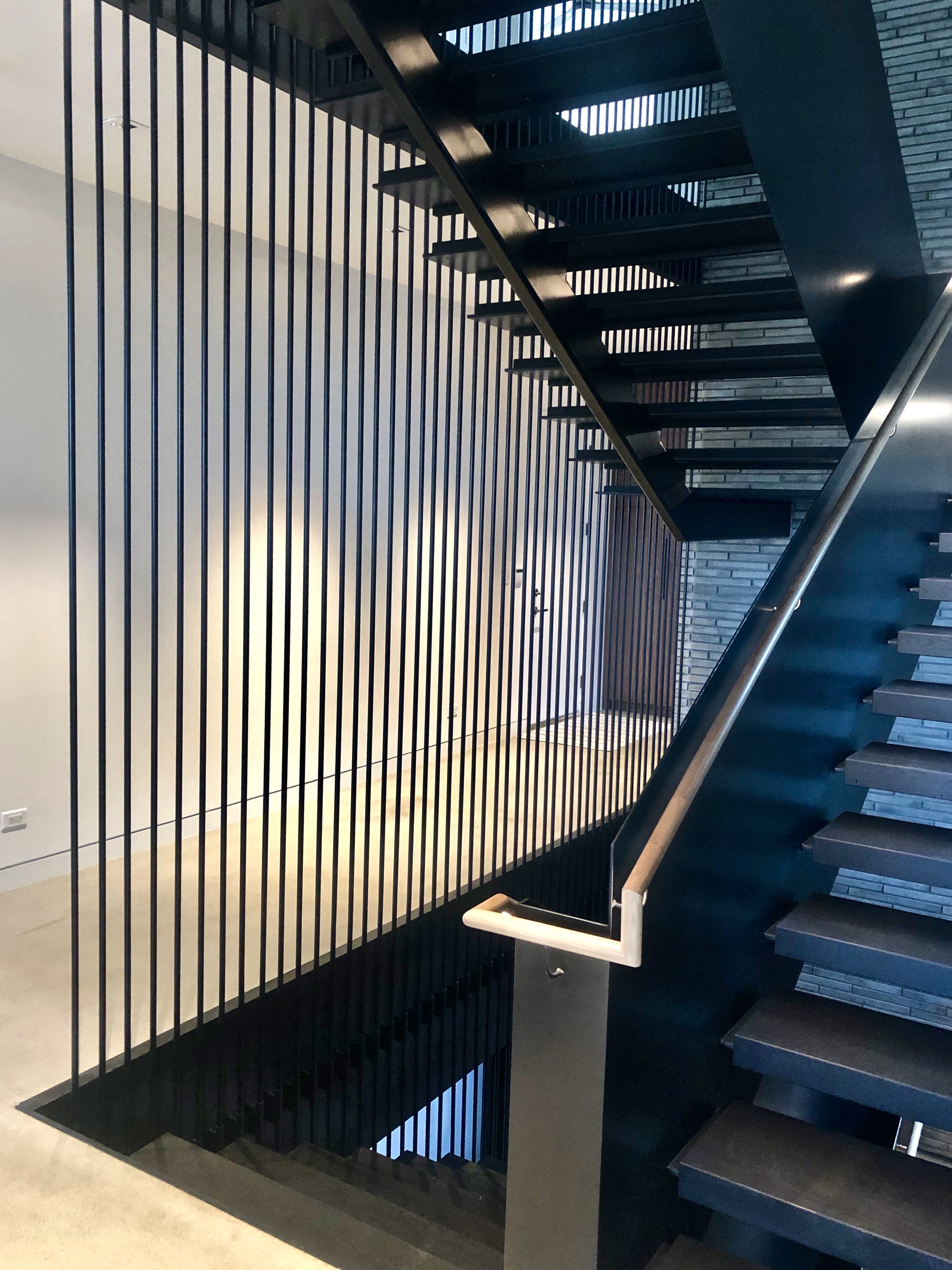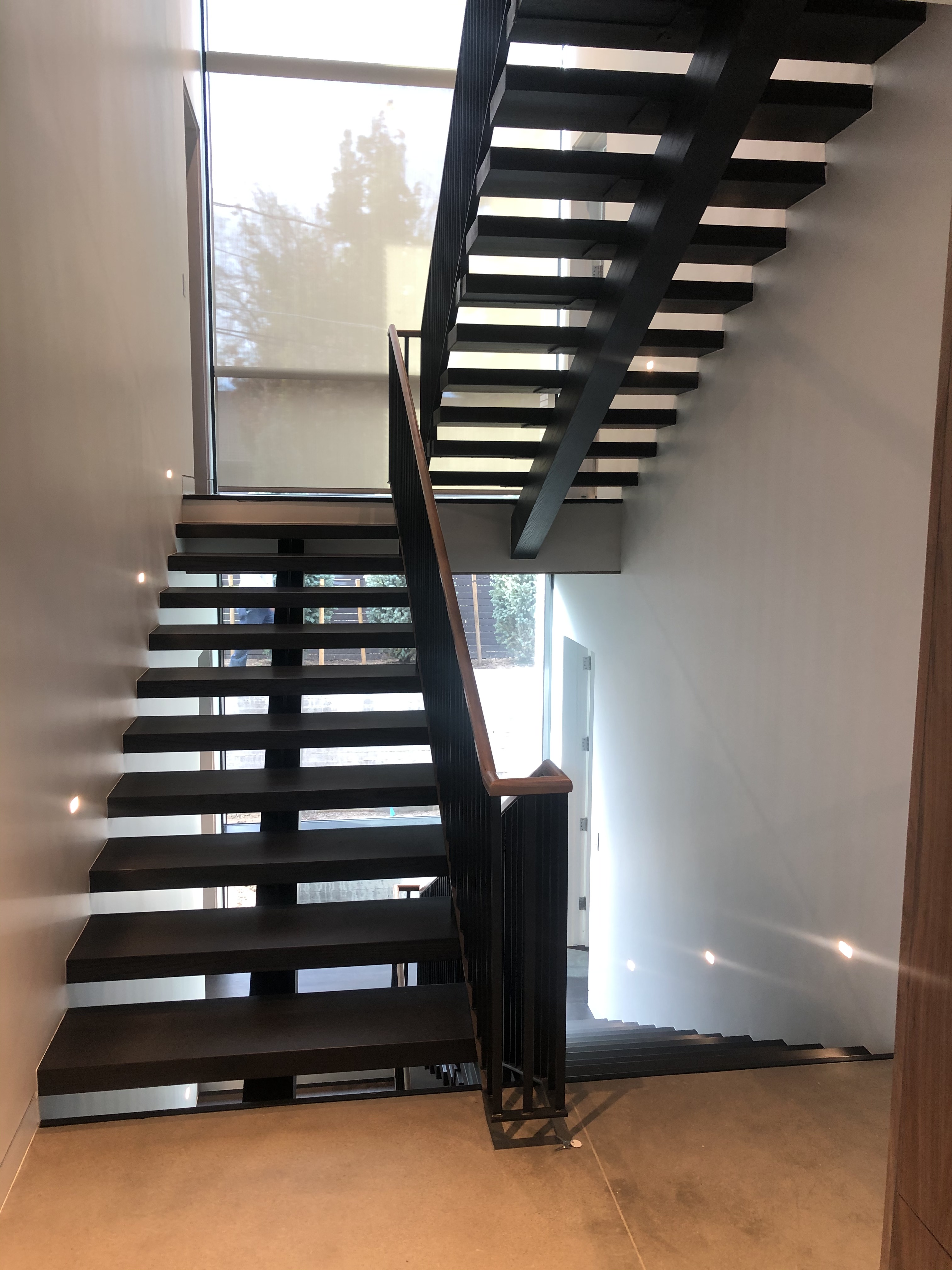 The main stair was built with a offset single spine, solid steel plate railing with a white oak illuminated handrail and 3/4″thick white oak treads. No exposed fasteners and hand built onsite.