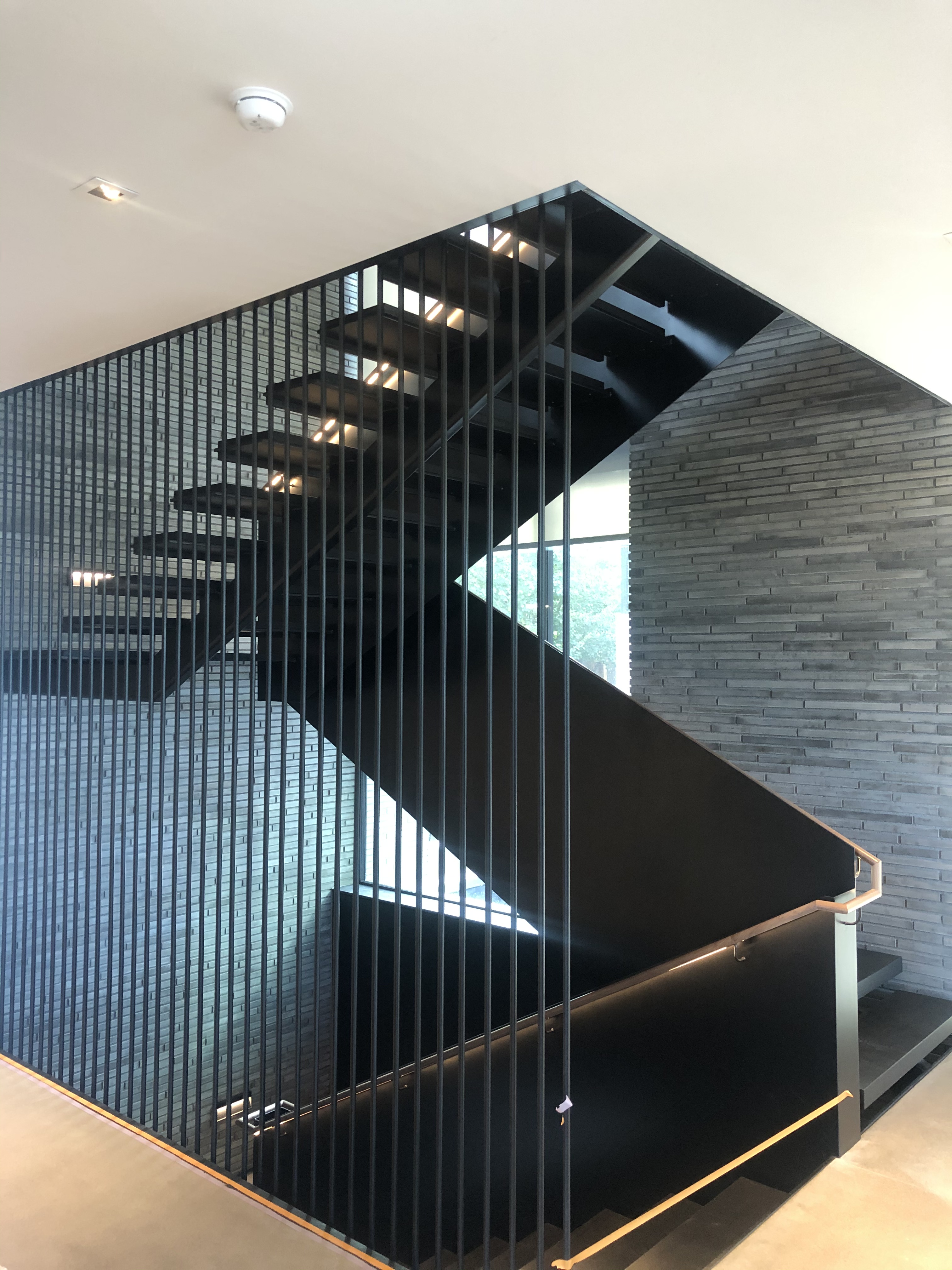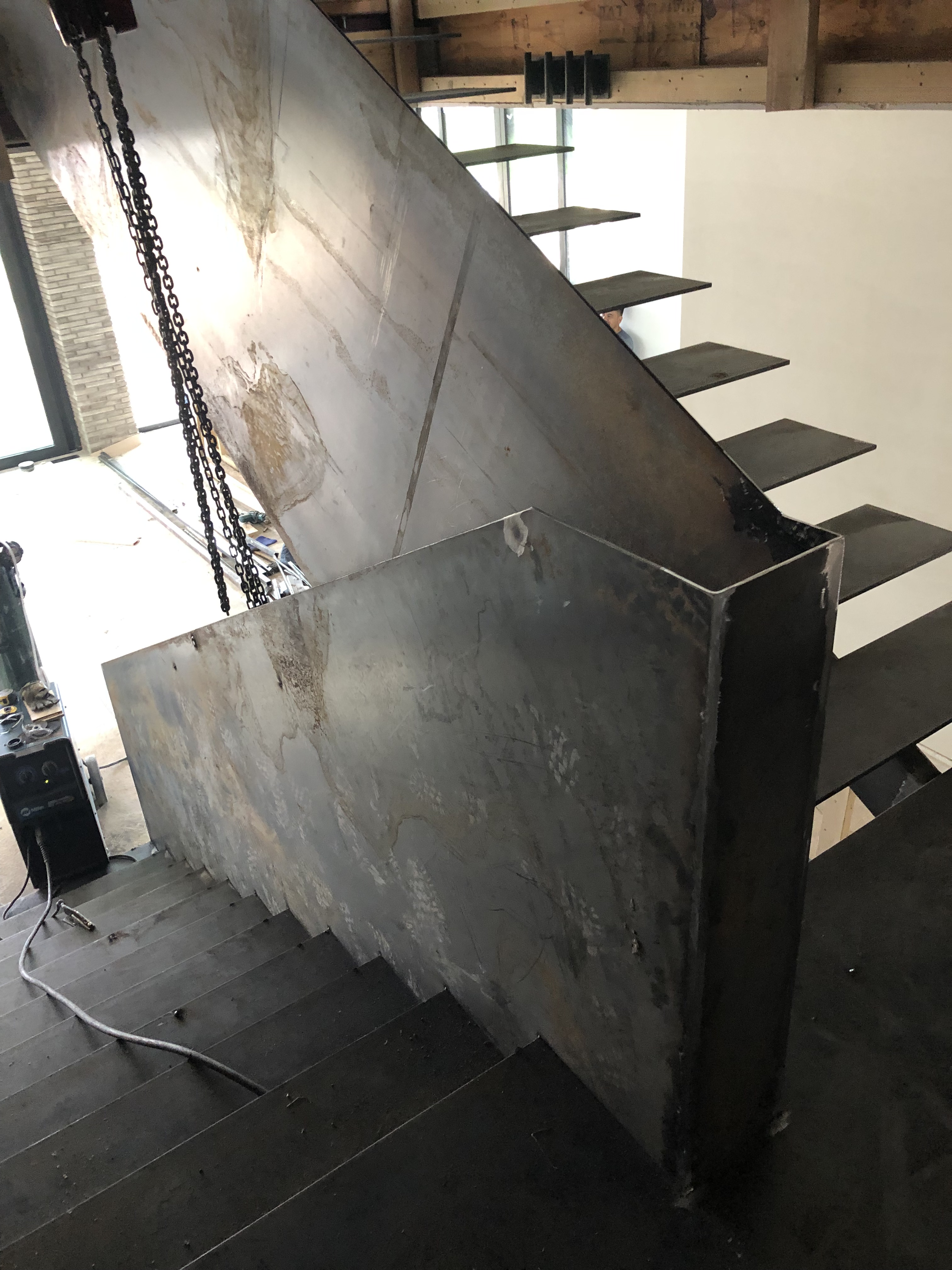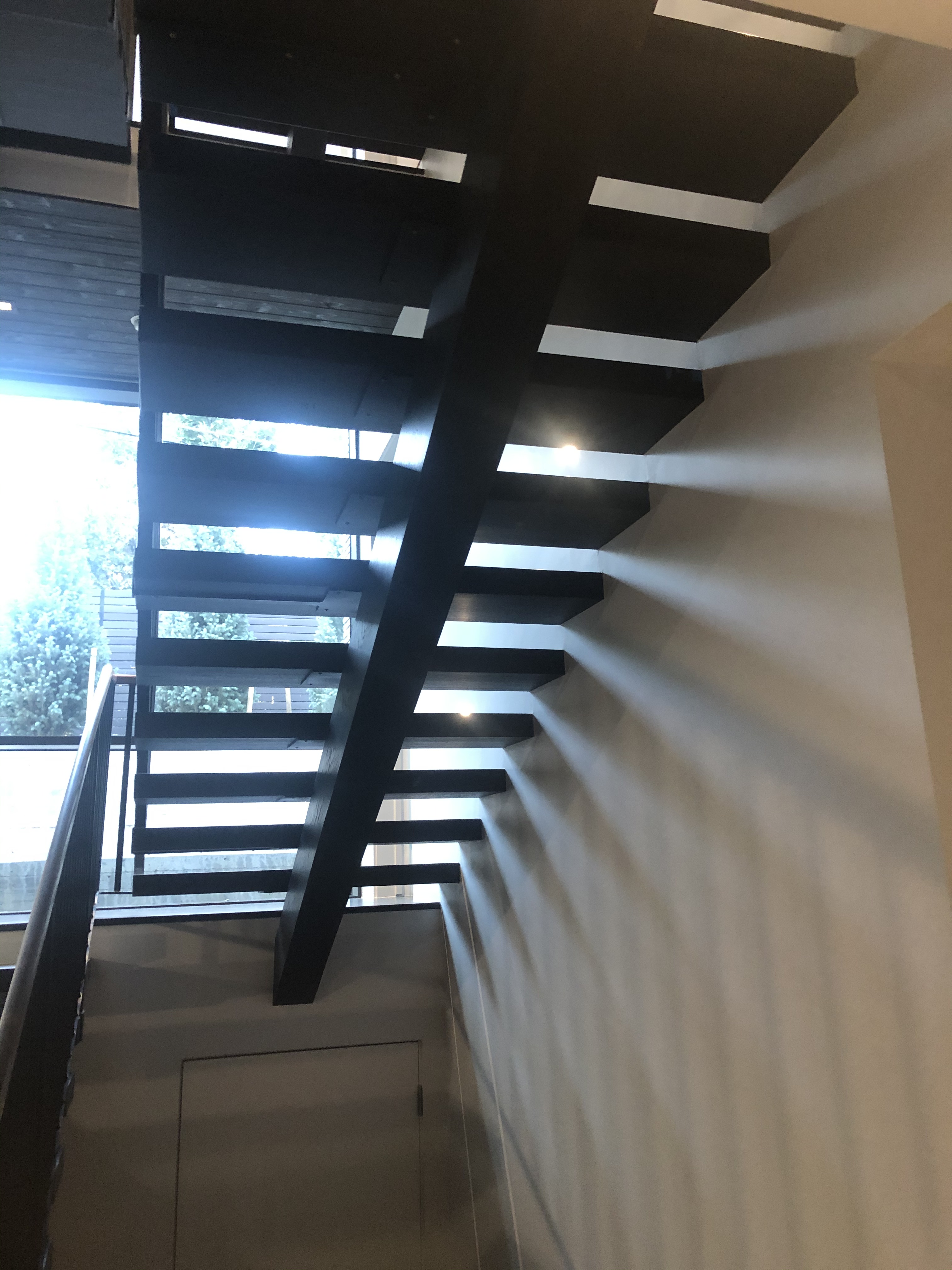 The main stair was built with a offset single spine, solid steel plate railing with a white oak illuminated handrail and 3/4″thick white oak treads. No exposed fasteners and hand built onsite.